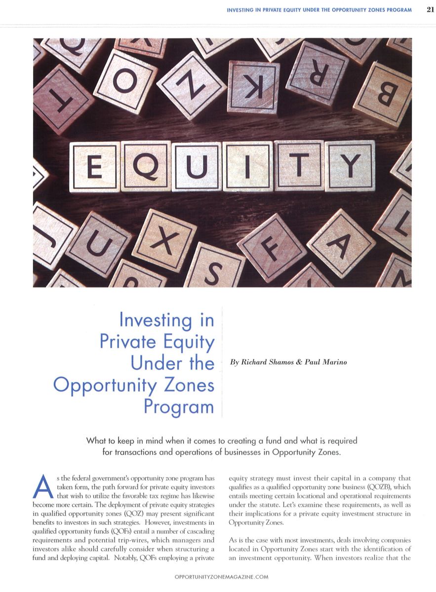 Paul Marino (Partner) and Richard Shamos (Counsel) wrote an article in a recent issue of OZ Magazine entitled, “Investing in Private Equity under the Opportunity Zones Program,” highlighting the formation of a Qualified Opportunity Fund, private equity investments in QOZ businesses, transaction requirements for QOZ businesses, operational requirements for QOZ businesses, and the impact of opportunity zones. To read the full text of the article, click here, on the button below, or continue scrolling.